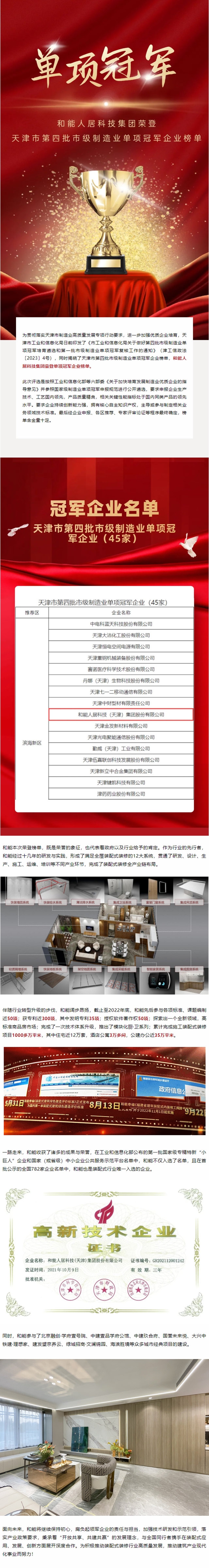 喜訊〡和能人居科技集團榮登天津市第四批市級制造業單項冠軍企業榜單!