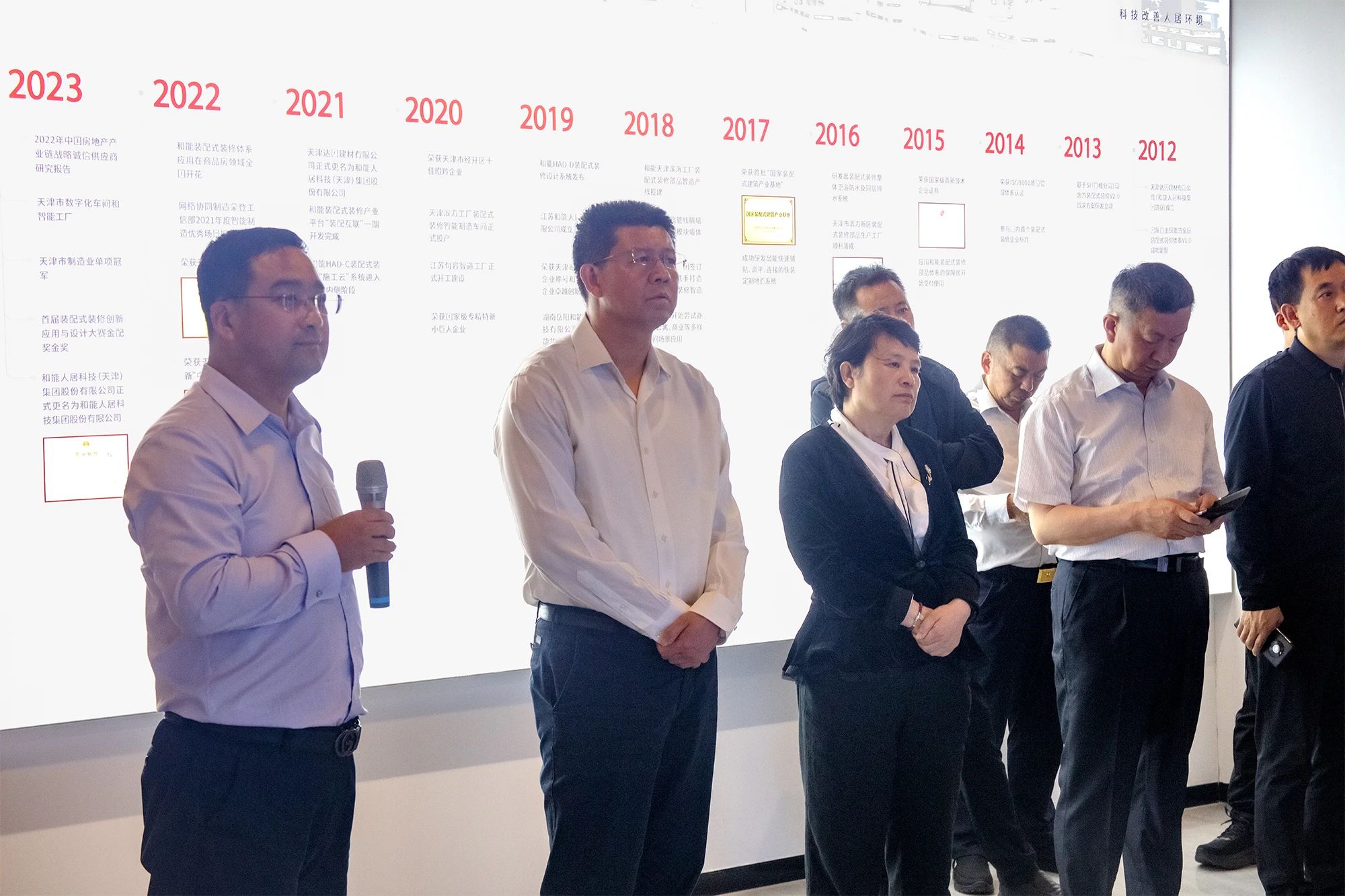 調(diào)研過程中,副總裁劉云龍邀請(qǐng)各位領(lǐng)導(dǎo)觀看了和能裝配式裝修7天快裝視頻,通過4位工人7天完成一套110平米3居室的全過程裝修實(shí)錄,向來賓直觀的展示了裝配式裝修在施工現(xiàn)場(chǎng)如何降本增效。與此同時(shí),現(xiàn)場(chǎng)還進(jìn)行了和能智能制造工廠,以及裝配式裝修智能建造好房子視頻展示。