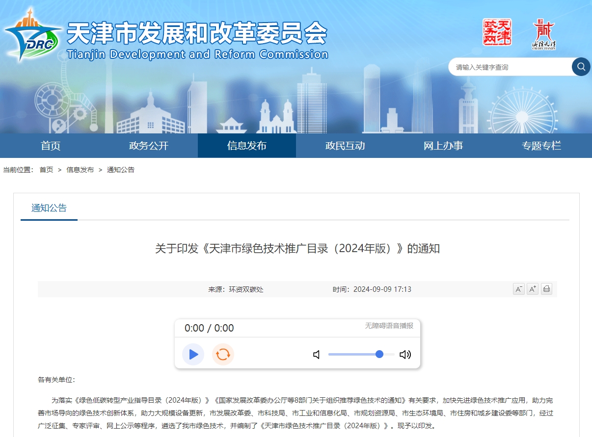 為落實《綠色低碳轉型產業指導目錄(2024年版)》《國家發展改革委辦公廳等8部門關于組織推薦綠色技術的通知》有關要求,加快先進綠色技術推廣應用,助力完善市場導向的綠色技術創新體系,助力大規模設備更新,市發展改革委、市科技局、市工業和信息化局、市規劃資源局、市生態環境局、市住房和城鄉建設委等部門,經過廣泛征集、專家評審、網上公示等程序,遴選了天津市綠色技術,并編制了《天津市綠色技術推廣目錄(2024年版)》。