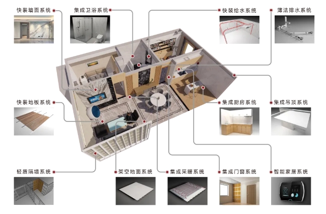 和能裝配式裝修智能建造技術通過工業化生產的方式把獨立出來的內裝修轉化為可批量生產的部品,并且通過連接構造設計實現現場裝配。具體包括全屋部品體系,即快裝墻面系統、快裝給水系統、薄法排水系統、集成衛浴系統、套裝門窗系統、集成吊頂系統、輕質隔墻系統、快裝地板系統、架空地面系統、集成采暖系統、集成廚房系統、智能家居系統。