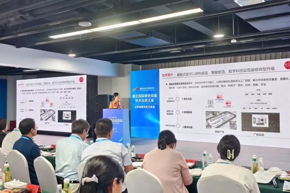 大賽啟動以來,得到了全國各地科創企業團隊的積極響應,共有來自全國26個省份336家企業團隊的389項作品參賽,初賽中,專家評審團細致評估,最終有160個作品晉級決賽。決賽現場,河北省住房和城鄉建設廳、生態環境廳、能源局等相關負責人,雄安新區各有關部門,行業專家、資本機構,各地市代表,雄安疏解央企及高校、建設單位代表等,約300余人齊聚場景匯。作為國家級綠色技術中唯一的內裝技術企業,和能人居科技集團提報的《裝配式裝修及智能建造技術》經過激烈角逐脫穎而出,以總排名第五的成績斬獲“雄安國際綠色低碳技術應用大賽”第二組,近零碳建筑材料、設備和技術組三等獎。