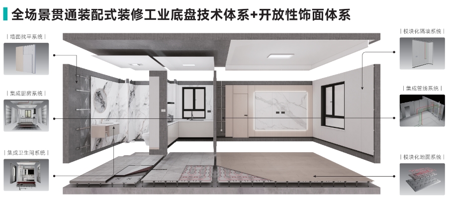 近零碳建筑賽道緊扣“好房子”建設,以好材料、好技術、好建造、好運維為核心,旨在打造系統性近零碳建筑解決方案。和能裝配式裝修及智能建造技術采用裝配式裝修融合智能建造技術建立了基層裝修與飾面層可分離的全屋裝修綠色部品體系,基層裝修使用模塊化的工業底盤部品提升品質與效率,飾面層支持多樣化選擇與DIY定制,解決裝修標準化與個性化的協調問題,同時依托智能化、低碳化生產與施工技術,減少室內裝修空氣、噪音、垃圾污染,降低能耗、物耗和水耗,實現建筑全生命期綠色低碳發展,滿足“人民對美好生活向往”。