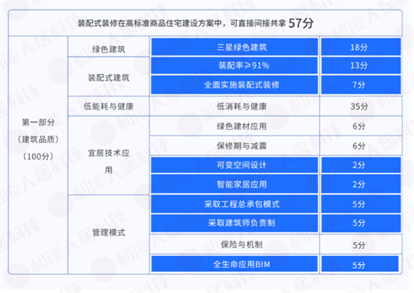 從首輪出讓條件的高標準評分表來看,裝配式建筑板塊,裝配式裝修不僅在“全面實施裝配式裝修”項直接拿7分,在91%裝配率方面直間接可拿到48%的裝配率。在整體建筑品質部分的100分中,裝配式裝修可直接、間接助力高標準商品住宅建筑品質拿57分,在高標準商品住宅評分標準中有著舉足輕重的作用。